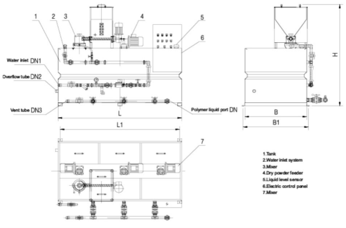 料斗中的PAM粉末藥劑經(jīng)定量供料裝置送入混合器中,與水進(jìn)行完全混合后進(jìn)入溶液箱中,混合液經(jīng)多級攪拌后形成均一濃度的溶液,最后進(jìn)入儲液箱內(nèi),經(jīng)計(jì)量泵投加至加藥點(diǎn)。集自動(dòng)配料、溶解、投加于一體,全自動(dòng)運(yùn)行;干投機(jī)的高精度輸送及加熱裝置的巧妙設(shè)計(jì),可減少結(jié)粒(塊)現(xiàn)象發(fā)生;干粉、進(jìn)水均可調(diào)整,可任意制備需要濃度的藥液隨機(jī)電控柜控制整個(gè)制備過程,當(dāng)粉末達(dá)到低料位時(shí)發(fā)報(bào)警信號提醒操作人員加料。